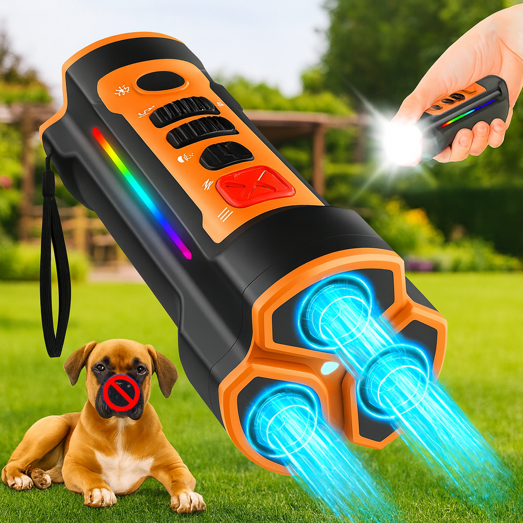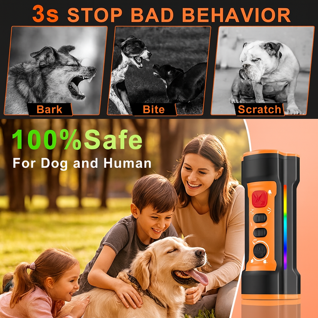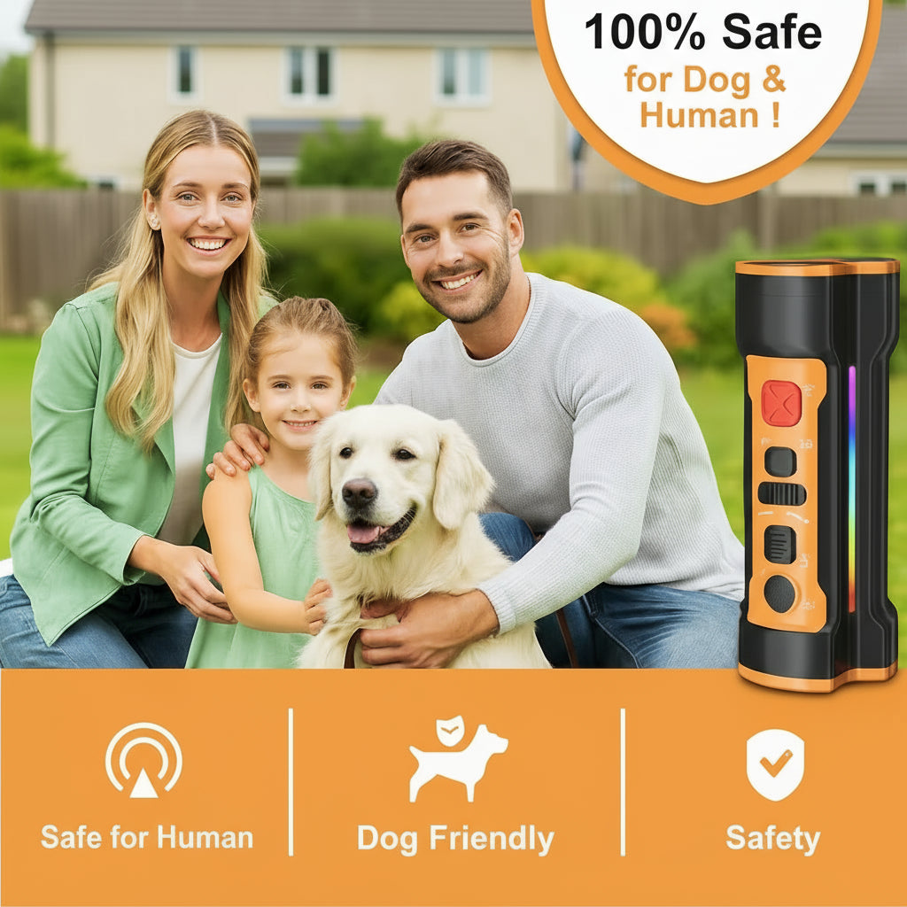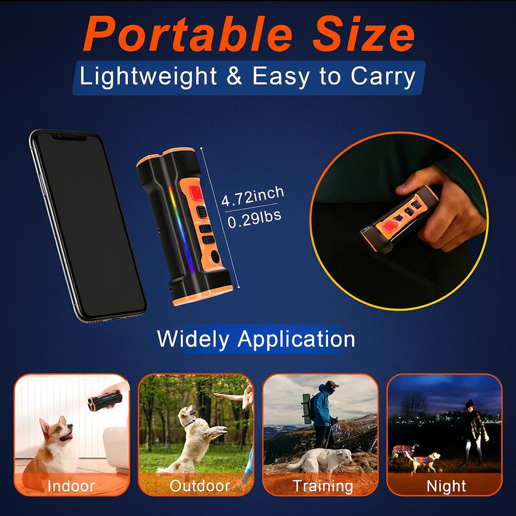 From your living room to the park, keep barking in check. Its portable design and handy flashlight make it your go-to solution, day or night.