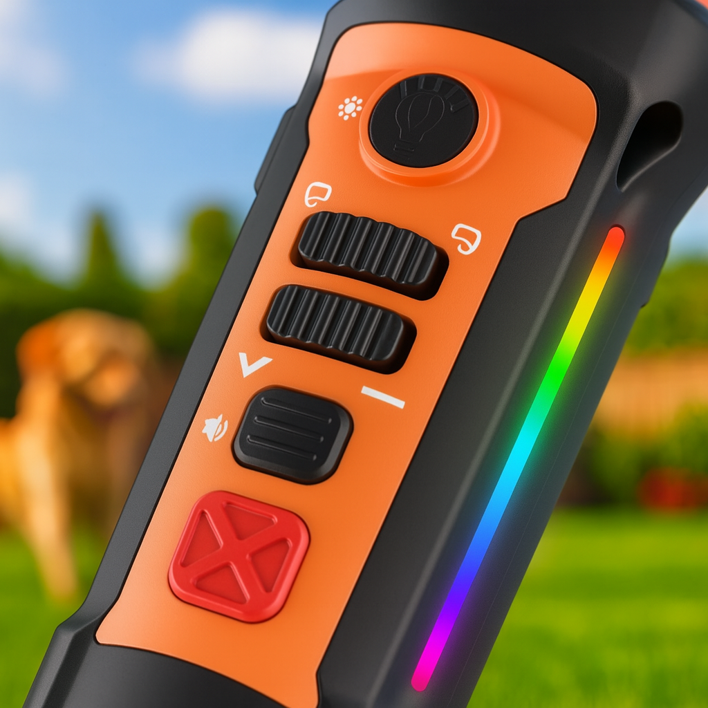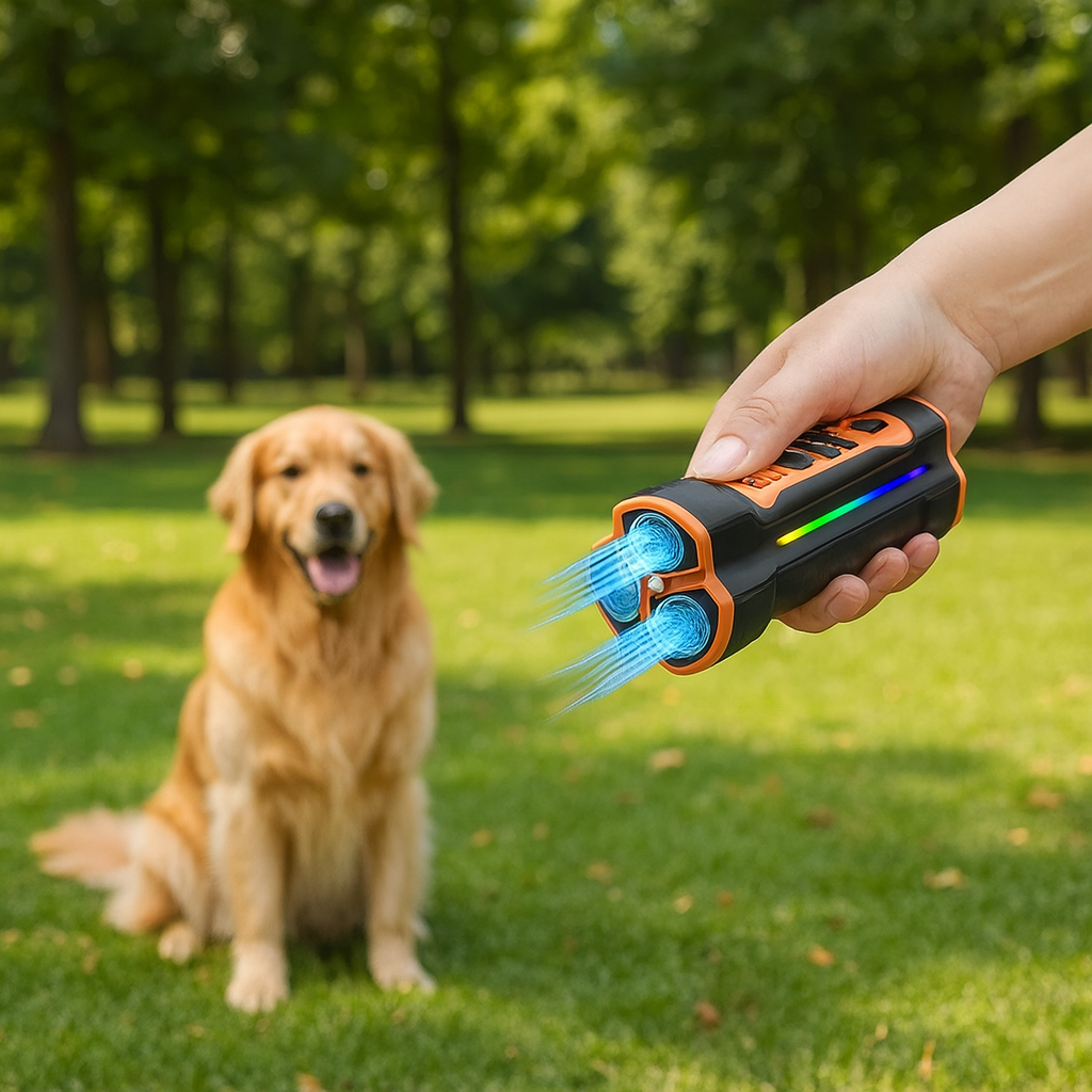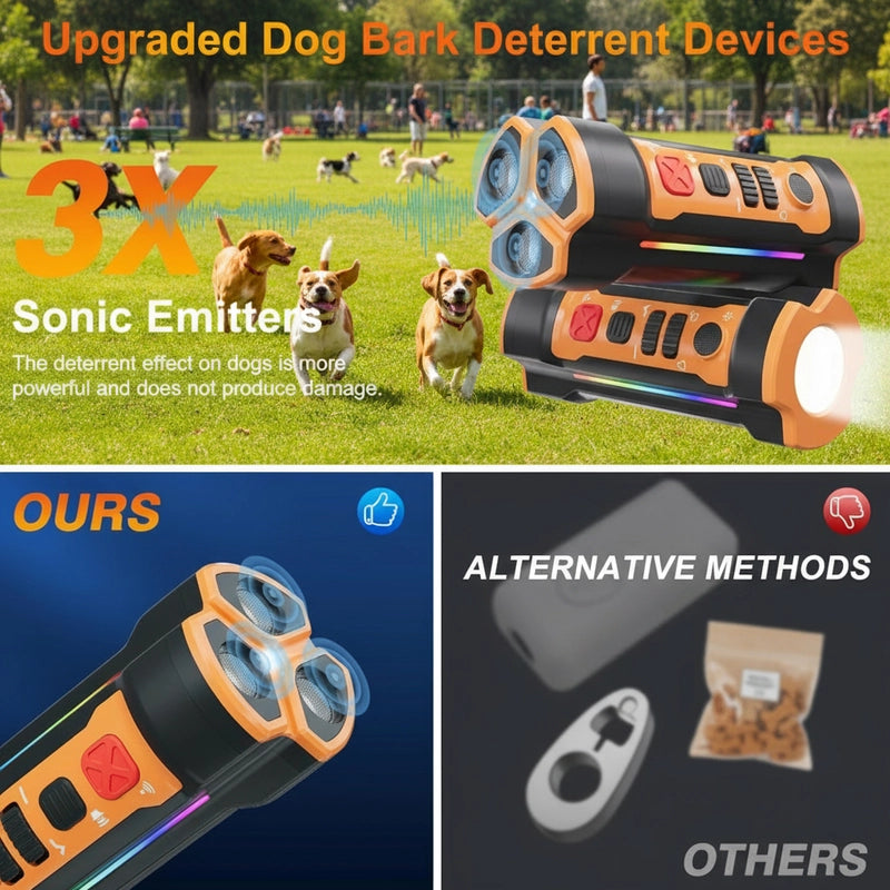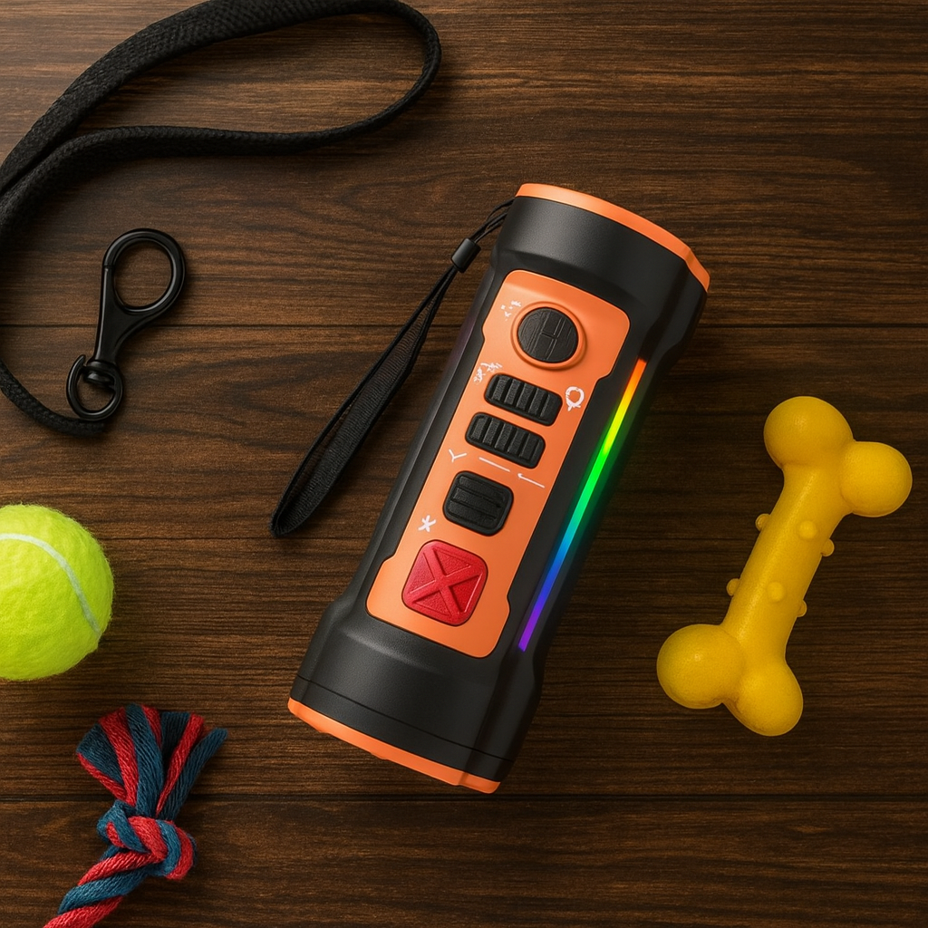 From your living room to the park, keep barking in check. Its portable design and handy flashlight make it your go-to solution, day or night.